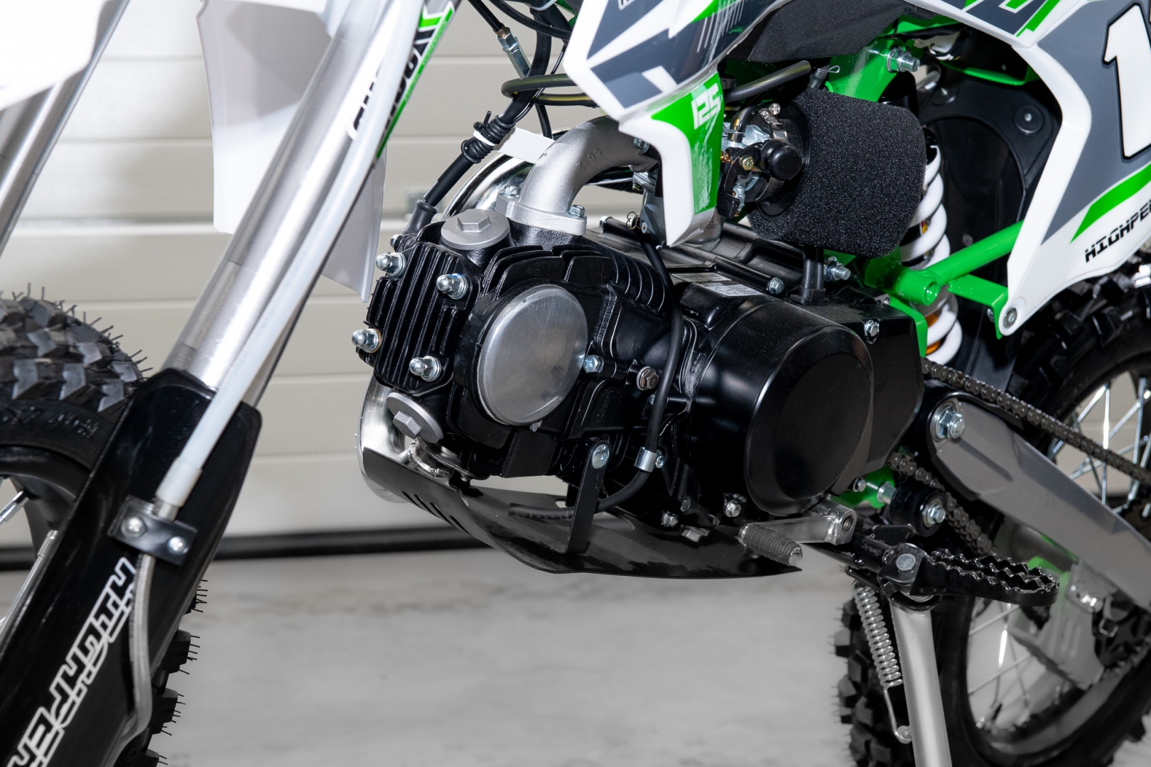 Az erőforrás 125 ccm-es, egyhengeres, négyütemű, léghűtéses motor 8 LE teljesítménnyel. 4 sebességes manuális váltóval szerelt. A lengéscsillapító elöl független dupla, hátul központi lengéscsillapító amely biztosan kidolgozza a terep egyenetlenségeit. Az első-hátsó tárcsafék segítségével elképesztően rövid féktávot tudunk venni miközben a motor stabilitása megmarad. Elöl 17"-os, hátul 14"-os kerékkel rendelkezik, off-road gumijainak köszönhetően tökéletes tapadásunk lesz. Az indítás berugókarral történik, így mindig menetkész lesz motorunk.